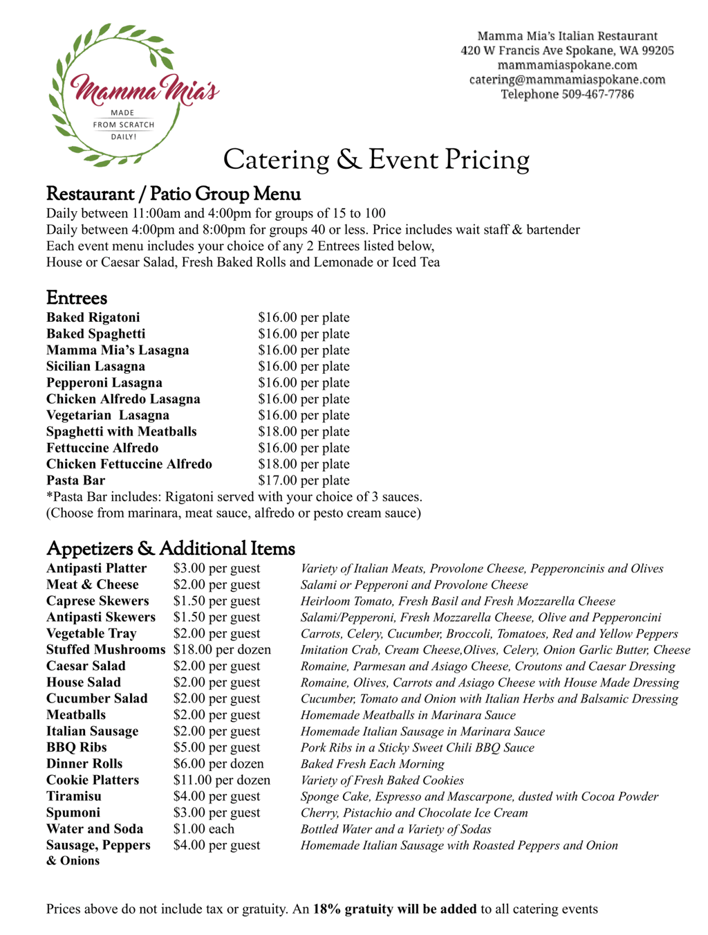 Whether it's dinner for two or you're hosting a gathering you can serve delicious Mamma Mia's cuisine at home.